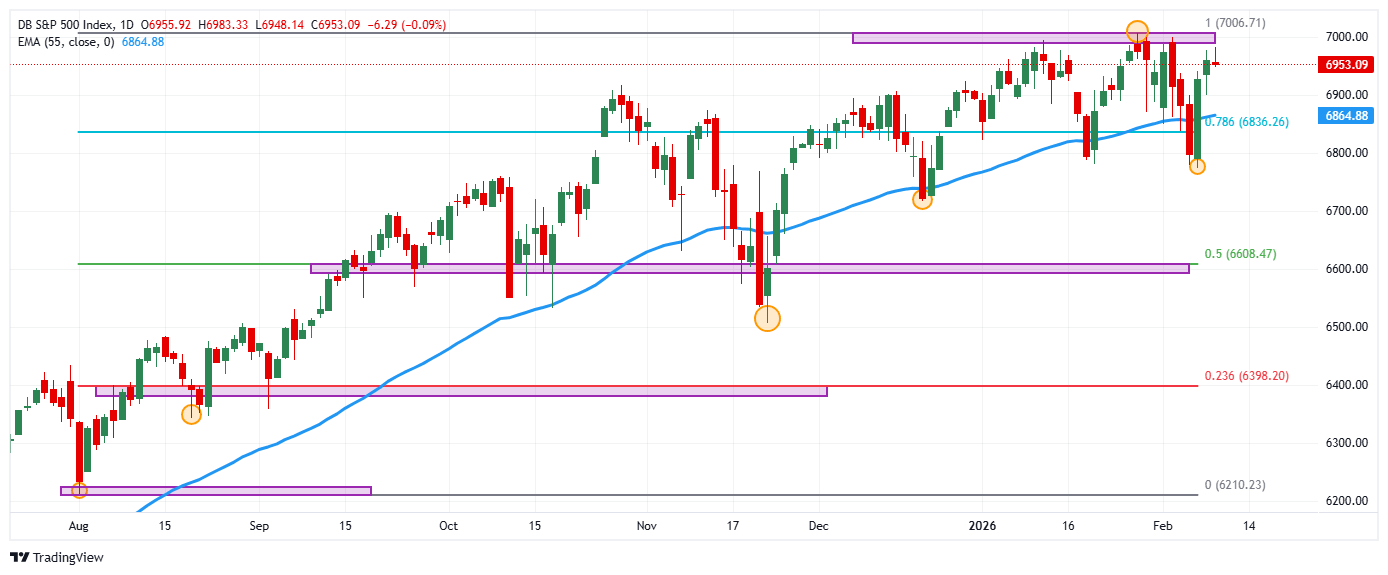 El S&P 500 formó un soporte en 6.717, mínimo del 17 de diciembre. La siguiente área de soporte clave se encuentra en 6.507, punto pivote del 21 de noviembre de 2025. Al alza, la resistencia más cercana está en 7.006, dada por el máximo histórico alcanzado el 28 de enero.