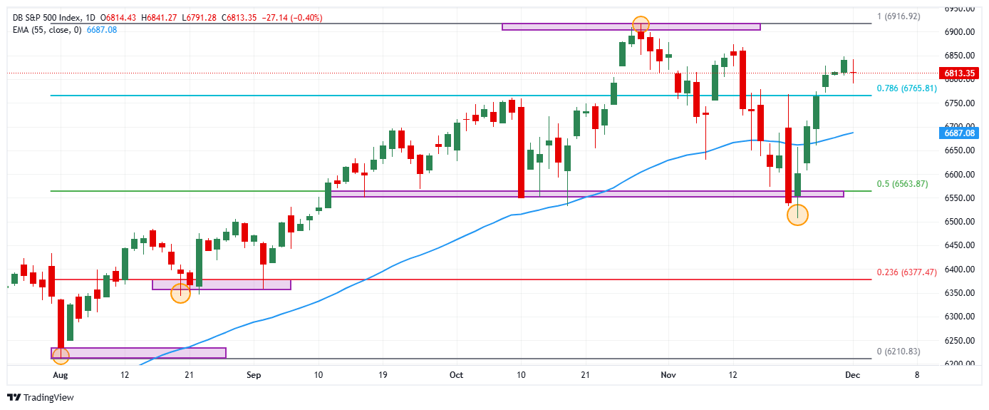 El S&P 500 estableció un soporte de corto plazo en 6.343, mínimo del 21 de noviembre. Al norte, la resistencia clave se encuentra en 6.917, máximo histórico alcanzado el 29 de octubre.