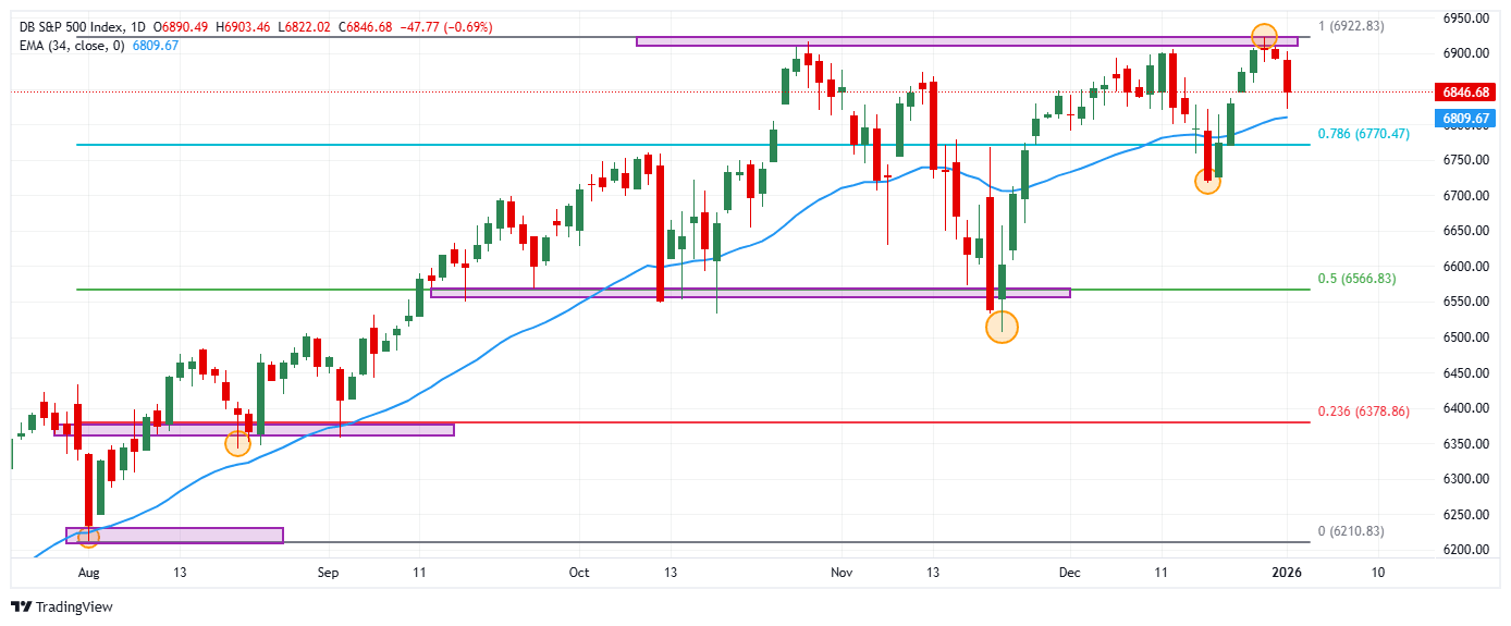 El S&P 500 marcó un máximo del día en 6.903, encontrando vendedores que llevaron el índice a mínimos del 19 de diciembre en 6.822. Actualmente, el S&P 500 pierde un 0.61%, cotizando sobre 6.848.