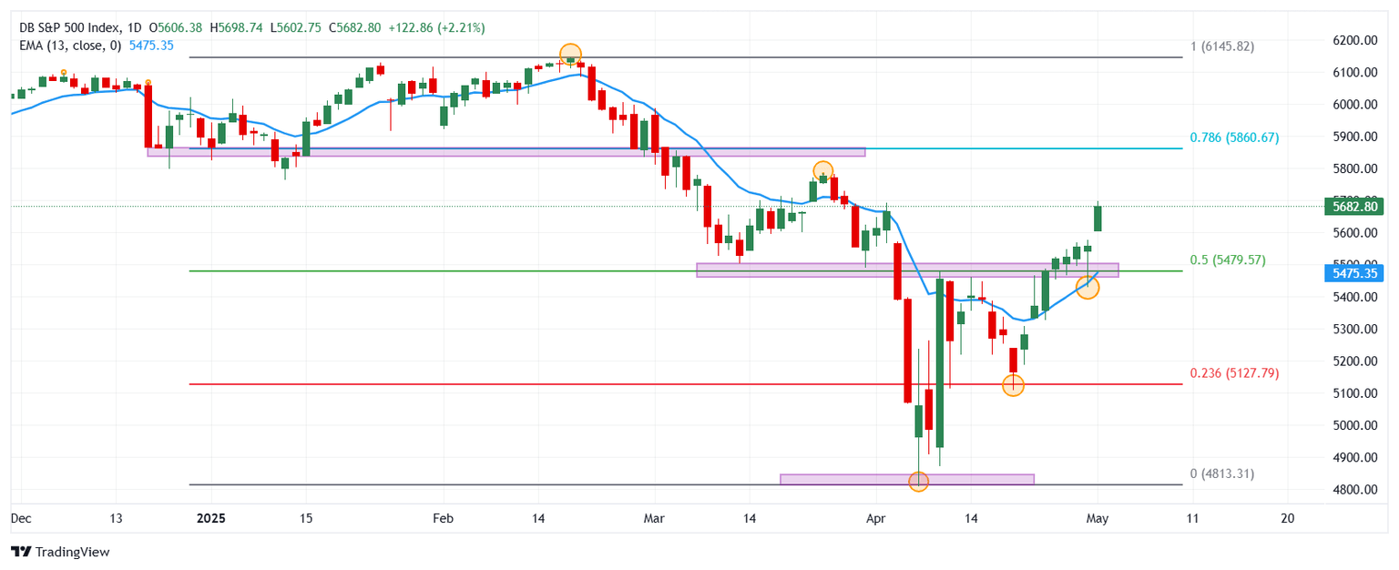 - El índice bursátil S&P 500 sube un 2.21% en el día, alcanzando máximos no vistos desde el 27 de marzo en 5.698.