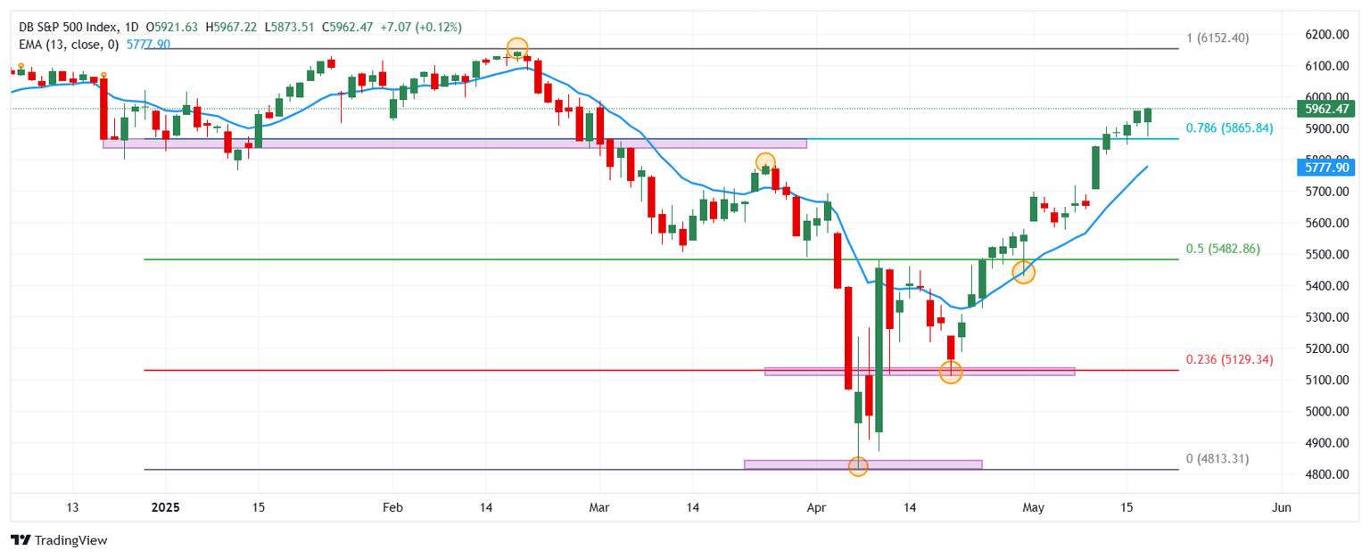 El S&P 500 estableció un mínimo del día en 5873, encontrando compradores que llevaron el índice a máximos del 3 de marzo en 5.967. Actualmente, el S&P 500 cotiza en 5.962 ganando un 0.12% el día de hoy.