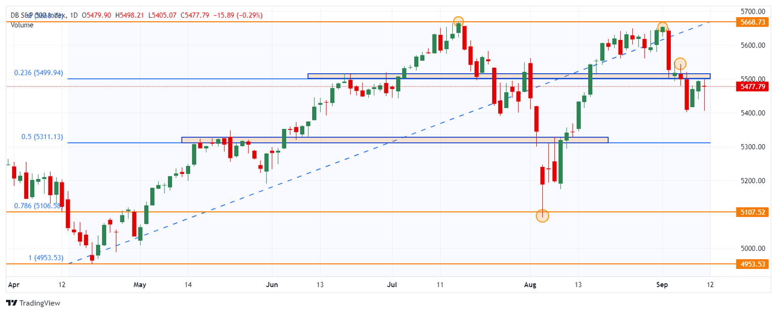 El S&P 500 marcó un máximo diario en 5.498, atrayendo vendedores que llevaron el índice bursátil a un mínimo de tres días en 5.405. Al momento de escribir, el S&P 500 opera sobre 5.473, cayendo un 0.39 % el día de hoy.