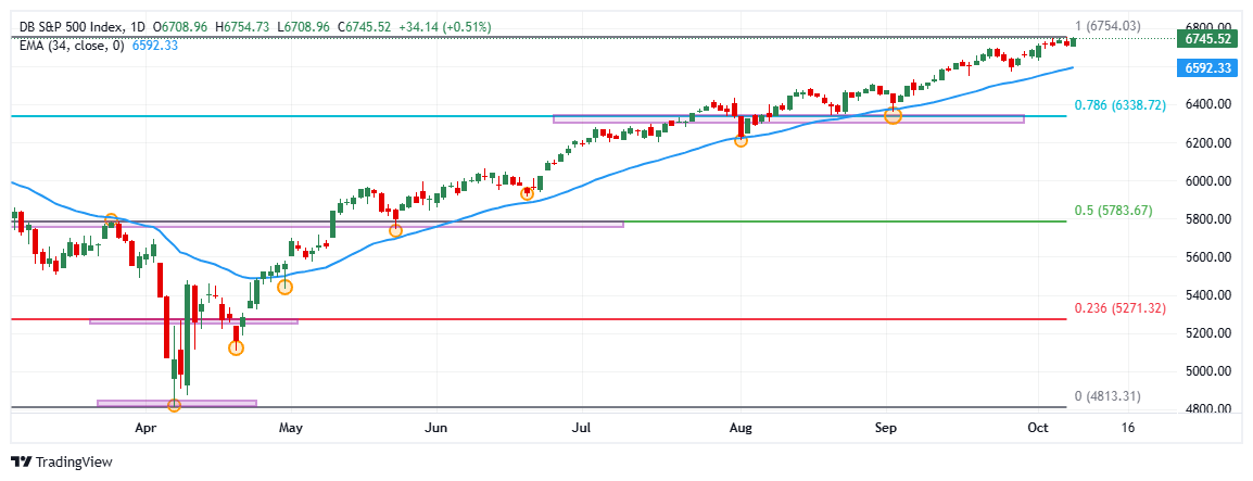 El S&P 500 estableció un mínimo del día en 6.708, atrayendo compradores agresivos que impulsaron el índice a nuevos máximos históricos en 6.754. Actualmente, el S&P 500 opera en 6.750, ganando un 0.58% en la tercera jornada de la semana.