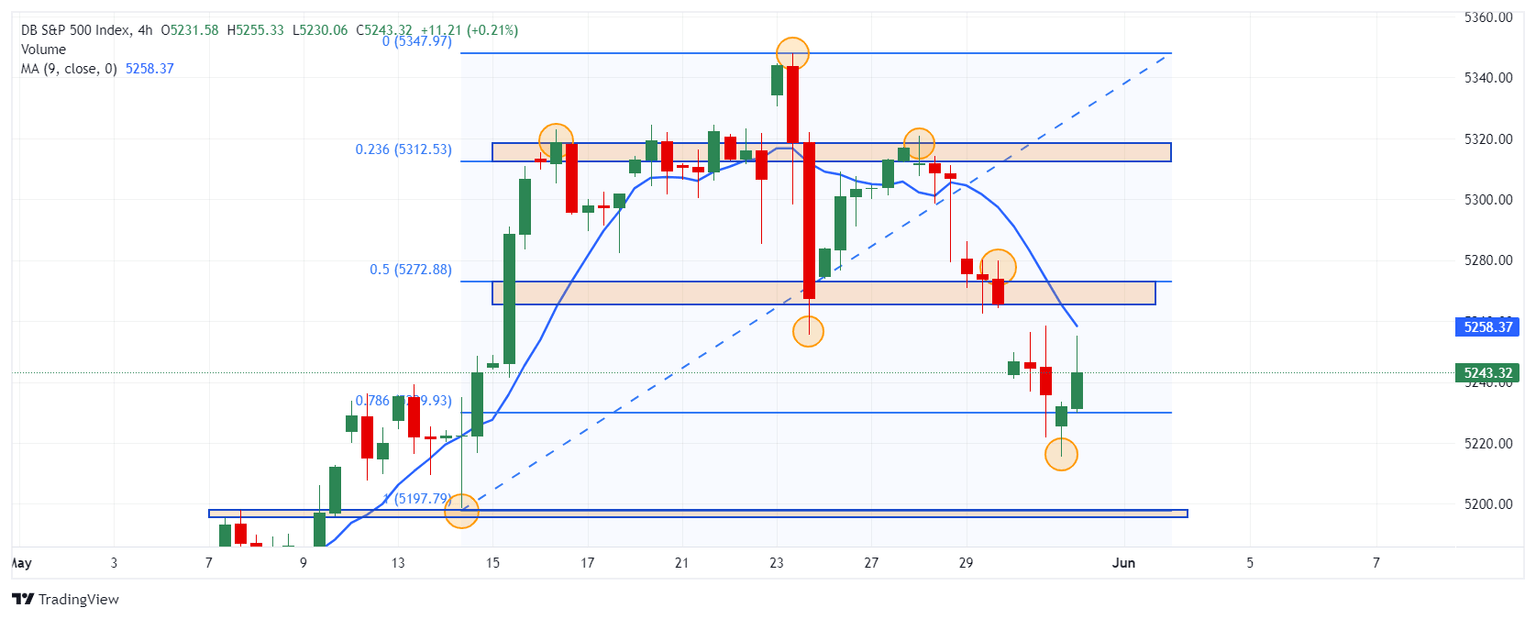 El S&P 500 ha establecido una serie de máximos más bajos, confirmando una tendencia bajista en el corto plazo. La primera resistencia la observamos en 5.320, dada por los puntos pivote del 28 de mayo en confluencia con el 23.6% de retroceso de Fibonacci. La segunda resistencia está en 5.347, máximo alcanzado el 23 de mayo. El soporte más cercano se ubica en 5.298, mínimo de la sesión del 14 de mayo.