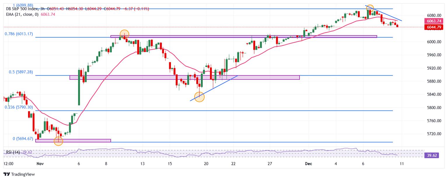 El S&P 500 reaccionó a la baja en una resistencia de corto plazo dado por el máximo histórico alcanzado el 6 de diciembre en 6.098. La primera zona de soporte se encuentra en 5.830, mínimo del 19 de noviembre. El siguiente soporte clave se encuentra en 5.694, punto pivote del 4 de noviembre.