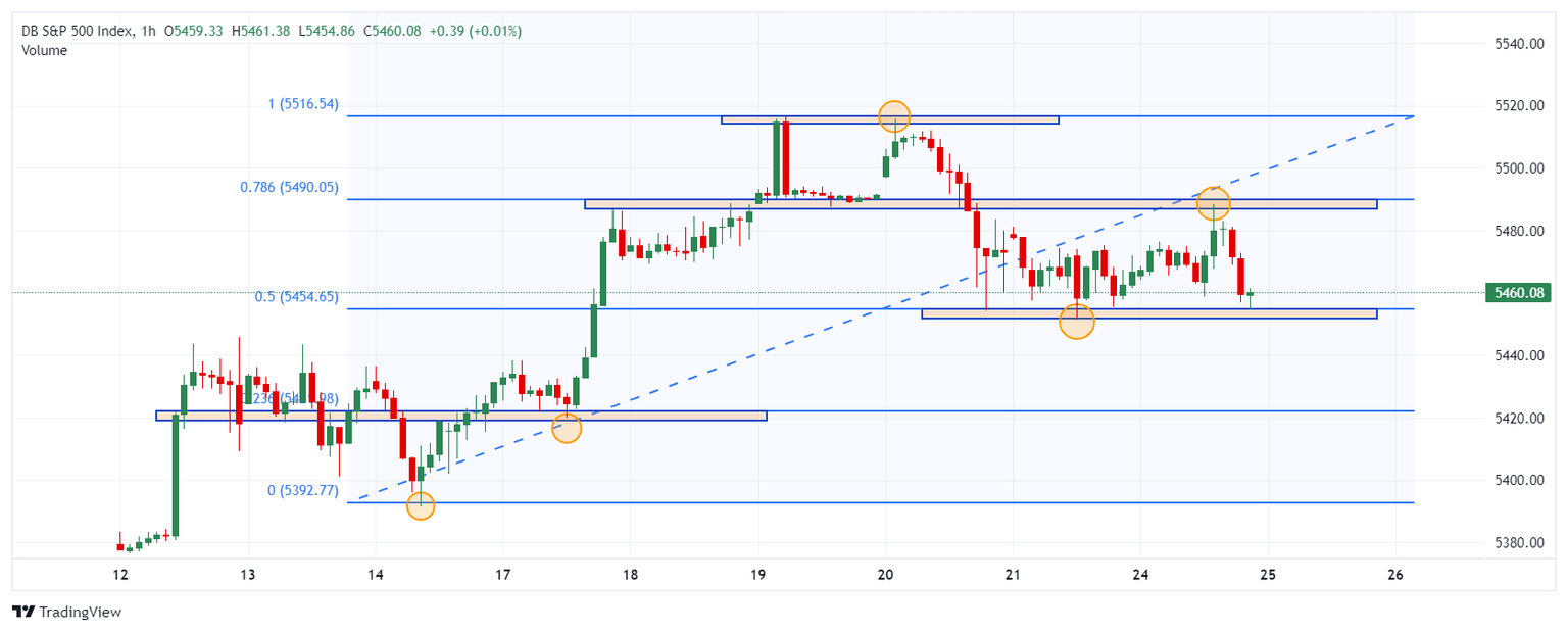 El S&P 500 registró un máximo del día en 5.481 durante la sesión americana, encontrando vendedores que llevaron el índice a un mínimo diario en 5.454. Al momento de escribir, el S&P 500 cotiza en 5.458, perdiendo un 0.15% en el día.