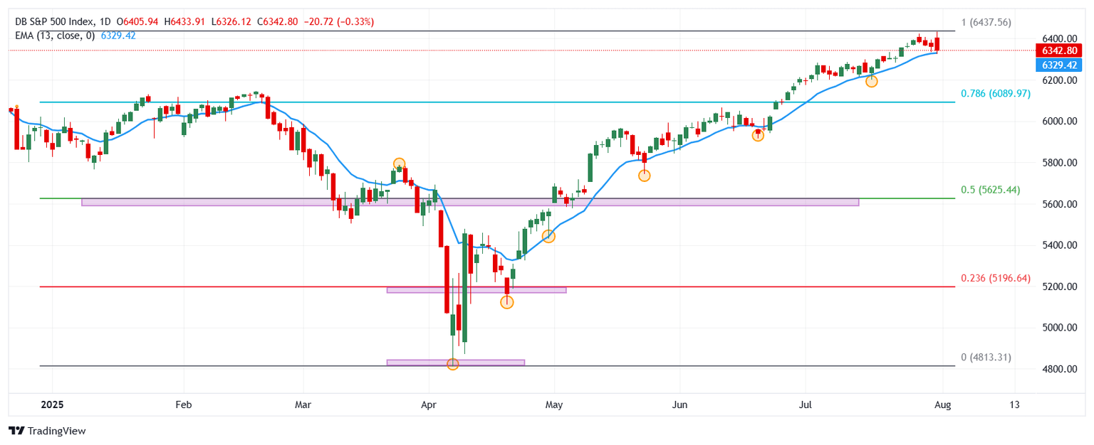 El S&P 500 reaccionó a la baja desde un nuevo máximo histórico alcanzado en 6.433, donde atrajo vendedores agresivos que llevaron el índice a mínimos del 23 de Julio en 6326. Actualmente, el S&P 500 opera sobre 6.332, cayendo un 0.48% en la jornada del jueves.