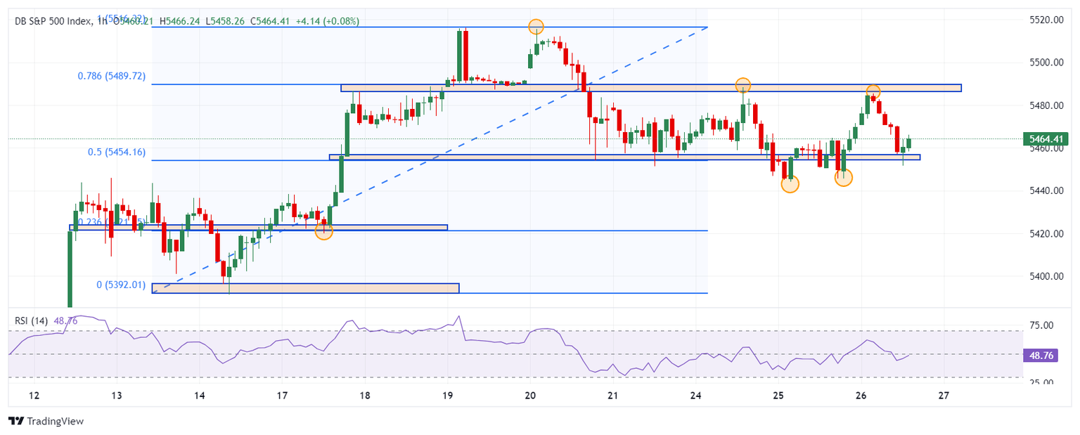 - El S&P 500 ha establecido un rango entre 5.488 y 5.444 durante las últimas sesiones.