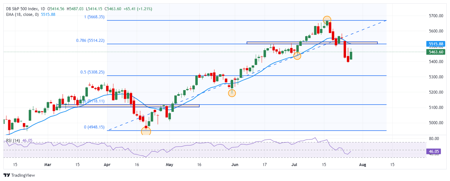 El S&P 500 alcanzó un mínimo durante la sesión europea en 5.414, encontrando interés comprador que llevó el índice a un máximo diario en 5.487, durante la sesión americana. Al momento de escribir, el S&P 500 opera en 5.460, ganando un 1.10% en el día.