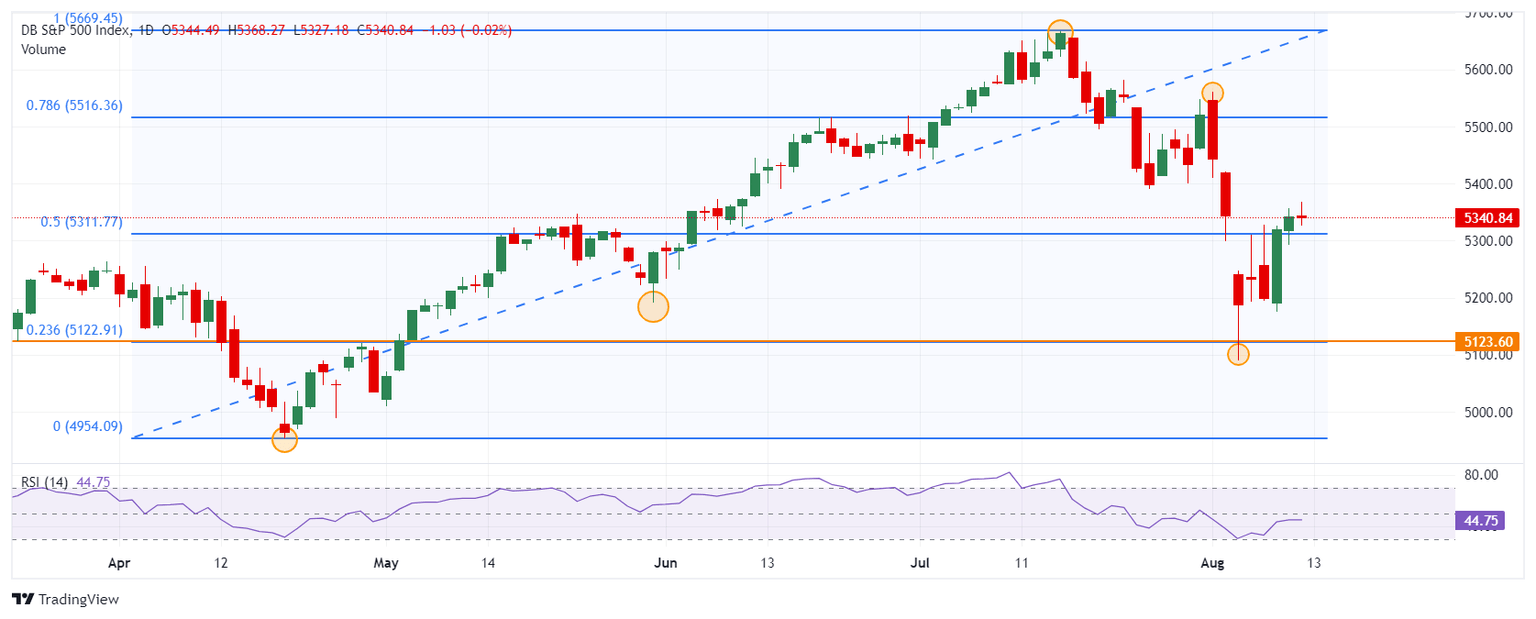 El S&P 500 alcnzó un mínimo diario 5.327, encontrando compradores que llevaron el índice a un máximo de la sesión 5.368. Al momento de escribir, opera en 5.350, ganando un 0.12% en el día.