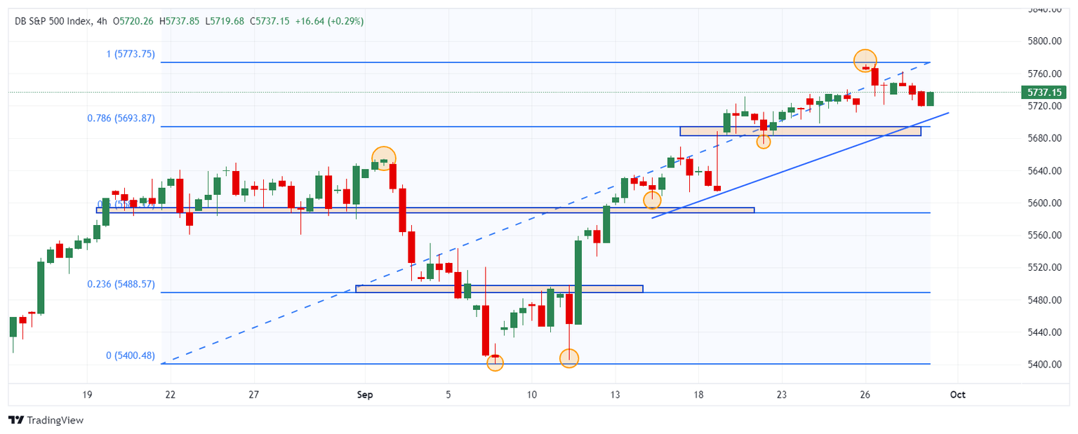 El S&P 500 reaccionó la baja en una resistencia de corto plazo dada por el máximo histórico alcanzado el 26 de septiembre en 5.772. El soporte más cercano lo encontramos en 5672, mínimo del 20 de septiembre en convergencia con el retroceso a 78.6% de Fibonacci. El siguiente soporte clave se encuentra en 5.604 punto pivote del 16 de septiembre.