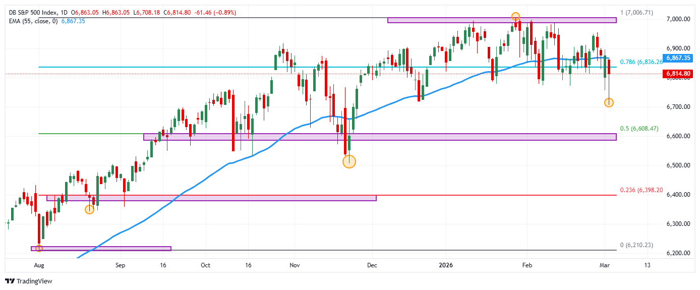 Ante este escenario, el S&P 500 retrocede 60 puntos, cotizando al momento de escribir en 6.815.