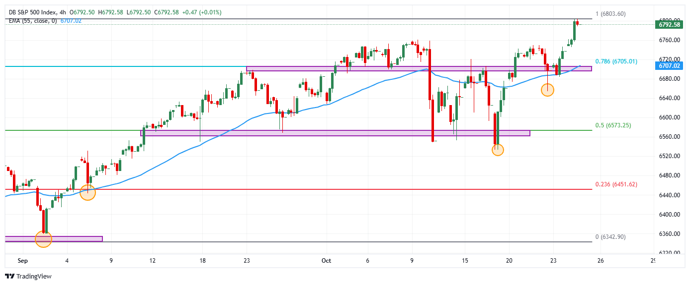 El S&P 500 registró un mínimo diario en 6.745, atrayendo compradores agresivos que impulsaron el índice a nuevos máximos históricos en 6.804. En estos momentos, el S&P 500 cotiza sobre 6.792, subiendo 0.82% diario.