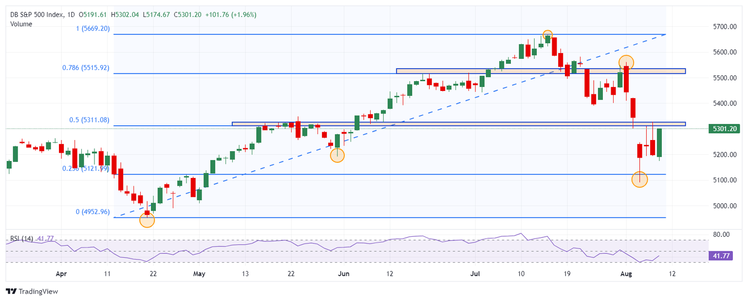 El S&P 500 marcó un mínimo diario en 5.174, encontrando compradores agresivos que llevaron el índice a un máximo del día en 5.296. Al momento de escribir, el índice opera en 5.295 subiendo un 1.86% el día de hoy.