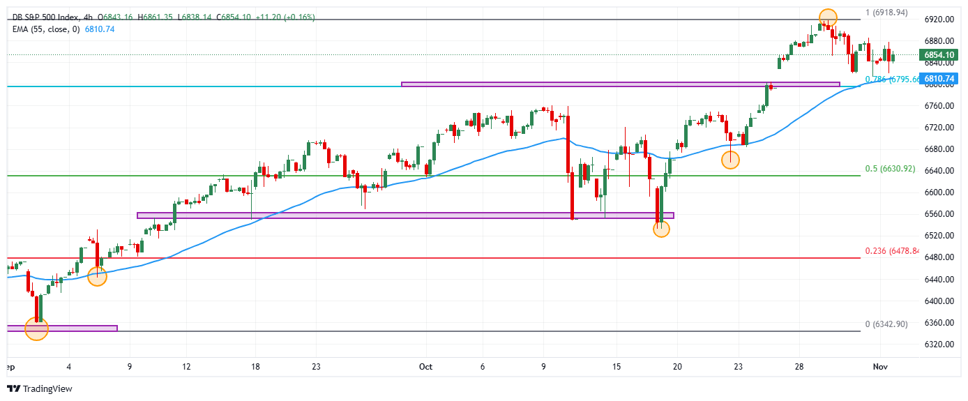 El S&P 500 estableció una resistencia de corto plazo dada por el máximo histórico alcanzado el 29 de octubre en 6.917. El soporte más cercano se encuentra en 6654, mínimo del 22 de octubre, cercano al promedio móvil exponencial de 55 periodos. Al sur, el siguiente soporte clave está en 6.533, punto pivote del 17 de octubre.