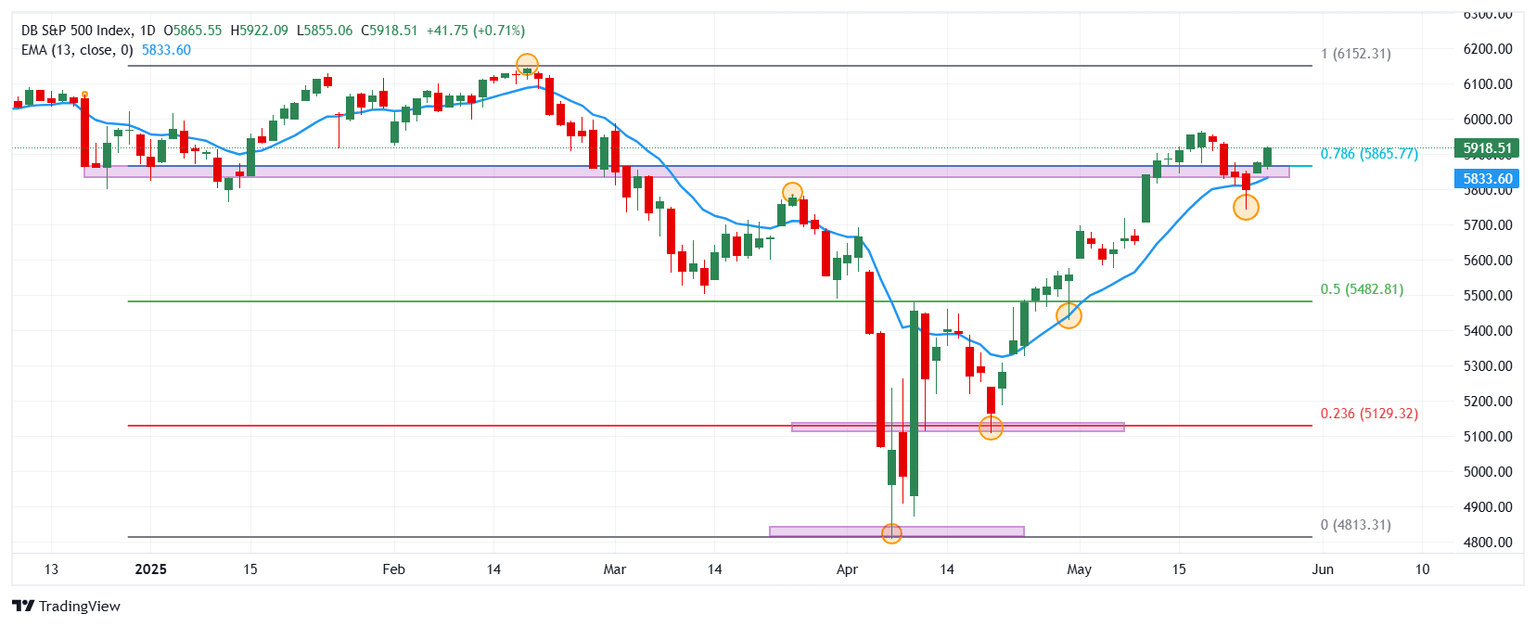 El S&P 500 estableció un mínimo del día en 5.855, atrayendo compradores agresivos que impulsaron el índice a un máximo no visto desde el 21 de mayo en 5.922. Al momento de escribir, el S&P opera sobre 5.918, ganando un 0.71% en la segunda jornada de la semana.