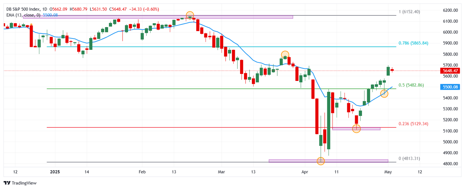 El S&P 500 reaccionó al alza desde un soporte de corto plazo dado por el mínimo del 21 de abril en 5.109. Al norte, la resistencia más cercana la observamos en 5.784 máximo del 25 de marzo. La siguiente resistencia importante se encuentra en 6.145, punto pivote del 19 de febrero.