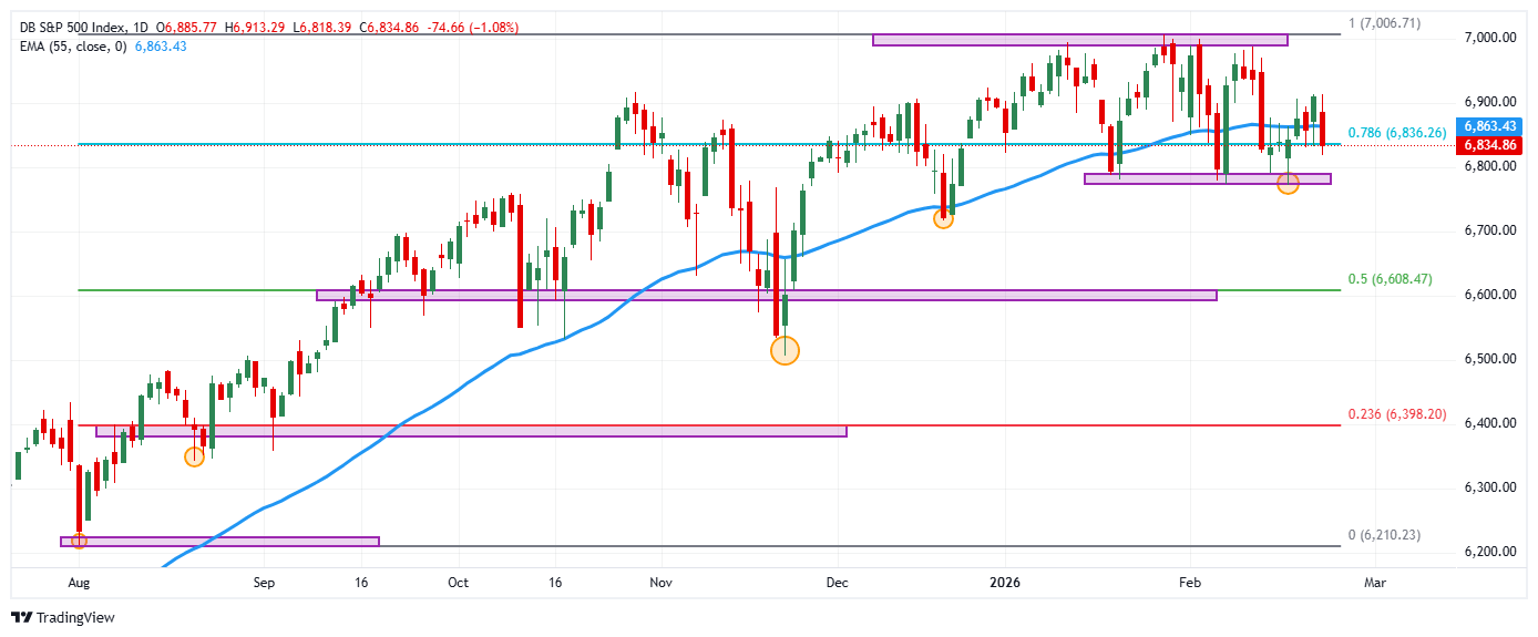 El S&P 500 marcó un máximo diario en 6.913, atrayendo vendedores agresivos que arrastraron el índice a mínimos del 17 de febrero en 6.818. En estos momentos, el S&P 500 cae un 1.18% en la jornada del lunes, operando en 6.822.