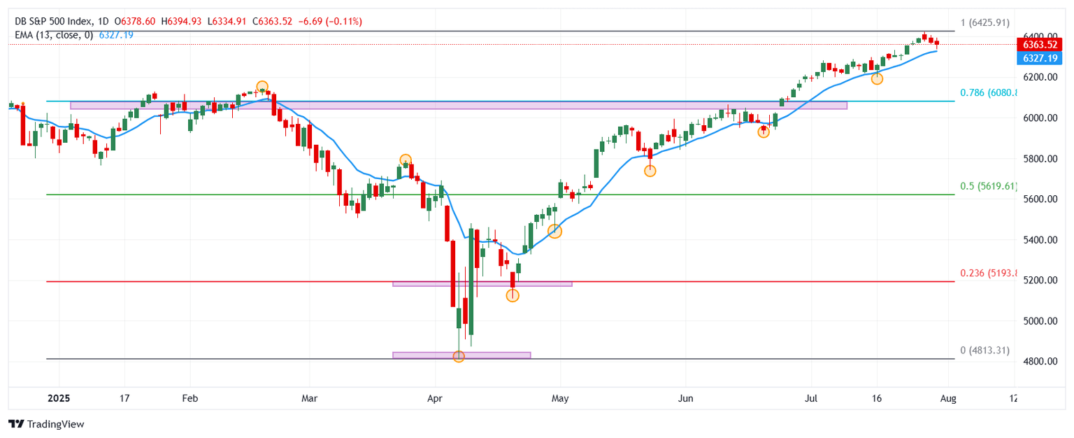 El S&P 500 marcó un máximo diario el 6.394, donde encontró vendedores que arrastraron el índice a mínimos del 23 de julio en 6.335. Al momento de escribir, el S&P 500 cotiza en 6.363, perdiendo un 0.11% en la jornada del miércoles.