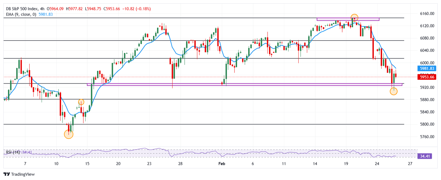 El S&P 500 estableció un máximo del día en 5.994, atrayendo vendedores agresivos que arrastraron el índice a un mínimo no visto desde el 15 de enero en 5.909. Actualmente, el S&P 500 cotiza sobre 5.953, cayendo un 0.53% dl día de hoy.