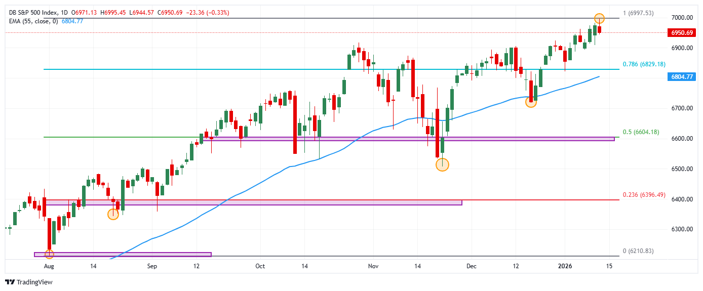 El S&P 500 reaccionó a la baja desde nuevos máximos históricos en 6.995, donde encontró vendedores agresivos que arrastraron el índice a un mínimo diario en 6.944. Actualmente, el S&P 500 pierde un 0.40% en el día, cotizando al momento de escribir sobre 6.945.