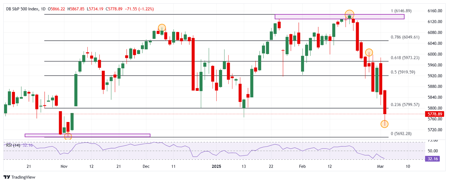 El S&P 500 marcó un máximo del día en 5.867 atrayendo a vendedores agresivos que llevaron el índice a un mínimo no visto desde el 5 de noviembre de 2024 en 5.734. En estos momentos, el S&P 500 cotiza sobre 5.778, perdiendo un 1.22% en la jornada del martes.