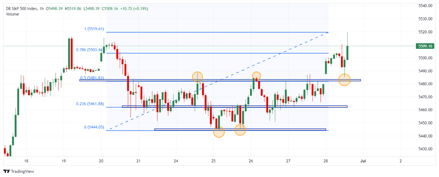 El S&P 500 registró un mínimo del día al inicio de la sesión americana en 5.484, rebotando hasta alcanzar un máximo diario en 5.519. Al momento de escribir, el S&P 500 cotiza en 5.511, ganando un 0.60%, el día de hoy.