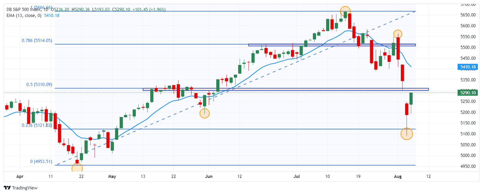 El S&P 500 reaccionó al alza en 5.090, mínimo del 5 de agosto que converge con el retroceso al 23.6% de Fibonacci. La resistencia más cercana se encuentra en 5.300, dado por el mínimo del 2 de agosto. La siguiente resistencia se encuentra en 5.515, que confluye con el retroceso al 78.6% de Fibonacci.