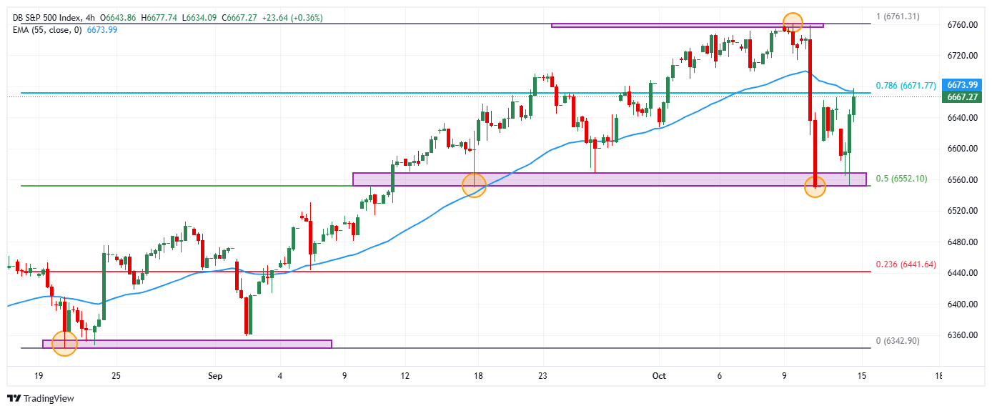 El S&P 500 reaccionó al alza desde mínimos del 10 de octubre en 6.552, donde encontró compradores agresivos que llevaron el índice a un máximo diario en 6.677. En estos momentos, el S&P 500 cotiza sobre 6.671, subiendo un 0.29% diario.