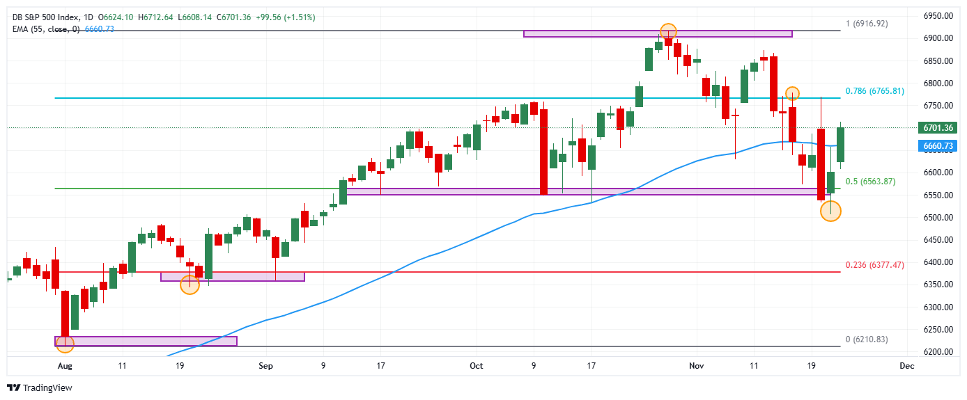 En este contexto, el S&P 500 sube 100 puntos, operando al momento de escribir sobre 6.701.