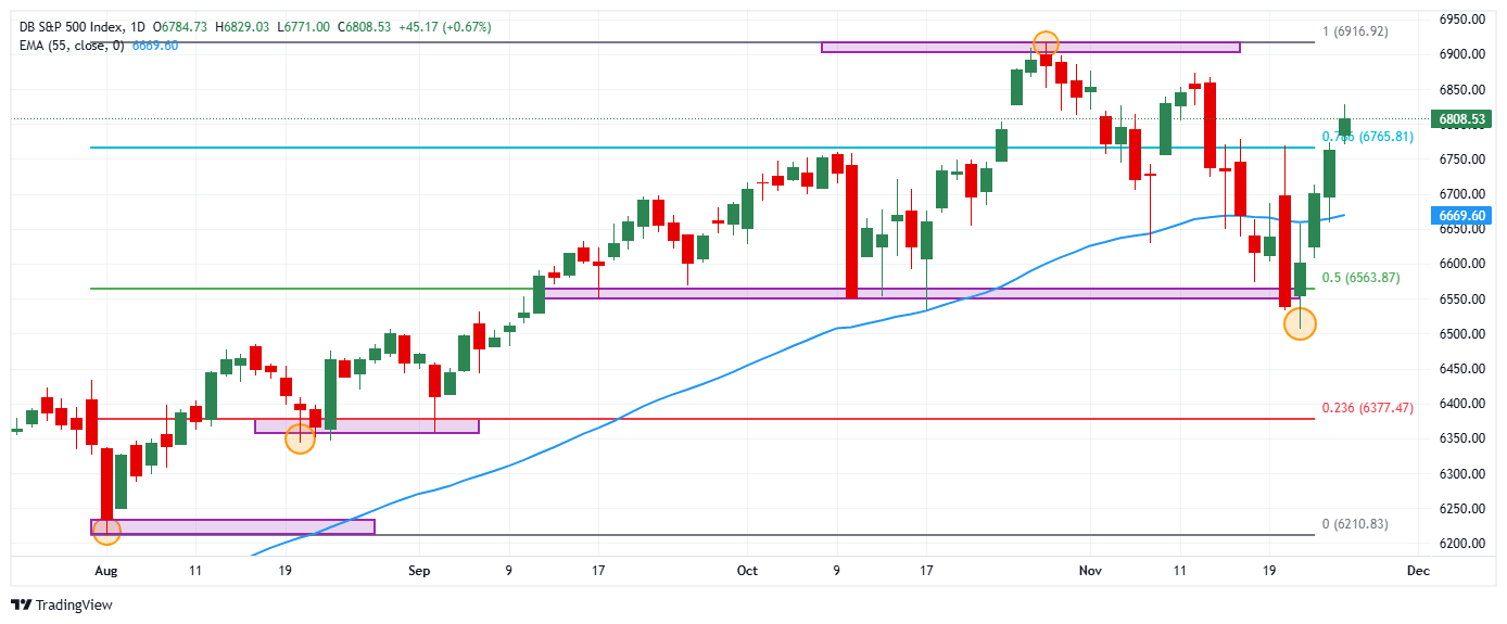 El S&P 500 marcó un mínimo del día en 6.771, atrayendo compradores agresivos que impulsaron el índice a máximos del 13 de noviembre en 6.829. Al momento de escribir, el S&P 500 cotiza en 6.808, subiendo un 0.67% en el día.