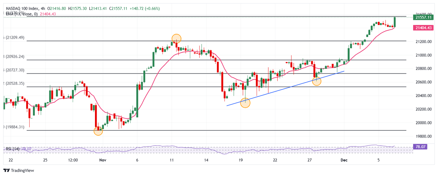 El índice tecnológico Nasdaq 100 repunta un 0.67% en el día, retomando la tendencia alcista y estableciendo nuevos máximos históricos en 21.575.