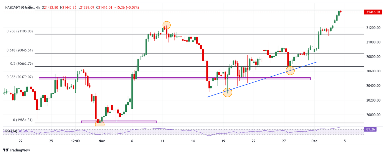 El índice tecnológico Nasdaq 100 gana un 0.96% el miércoles, cotizando al momento de escribir en 21.429, alcanzando un nuevo máximo histórico en 21.445.