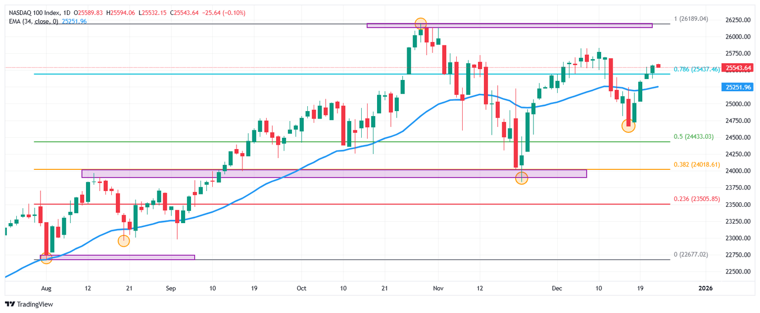El índice tecnológico Nasdaq 100 se desliza un 0.11% en el día, registrando un mínimo diario en 25.537.