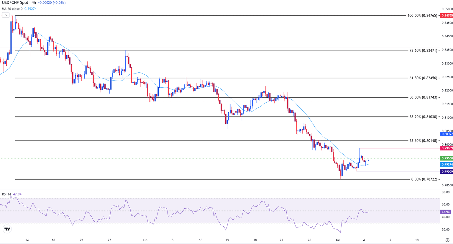 El gráfico de 4 horas ilustra una consolidación de la acción del precio del USD/CHF por encima de 0.7940. Las velas poco profundas reflejan indecisión a la luz de la falta de liquidez de EE.UU. debido a las vacaciones del Día de la Independencia.