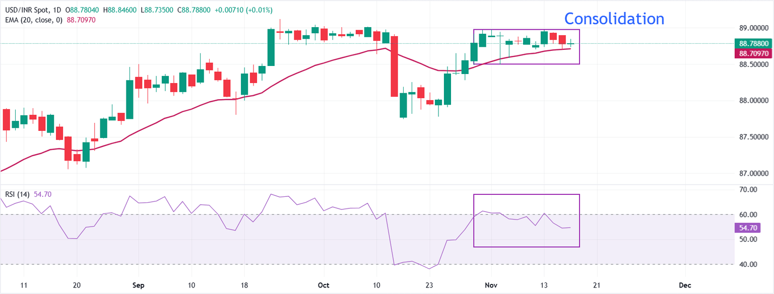 El USD/INR se mantiene lateral por debajo de 89.00 durante más de dos semanas. La media móvil exponencial (EMA) de 20 días cerca de 88.70 continúa actuando como soporte clave para los alcistas del USD.
