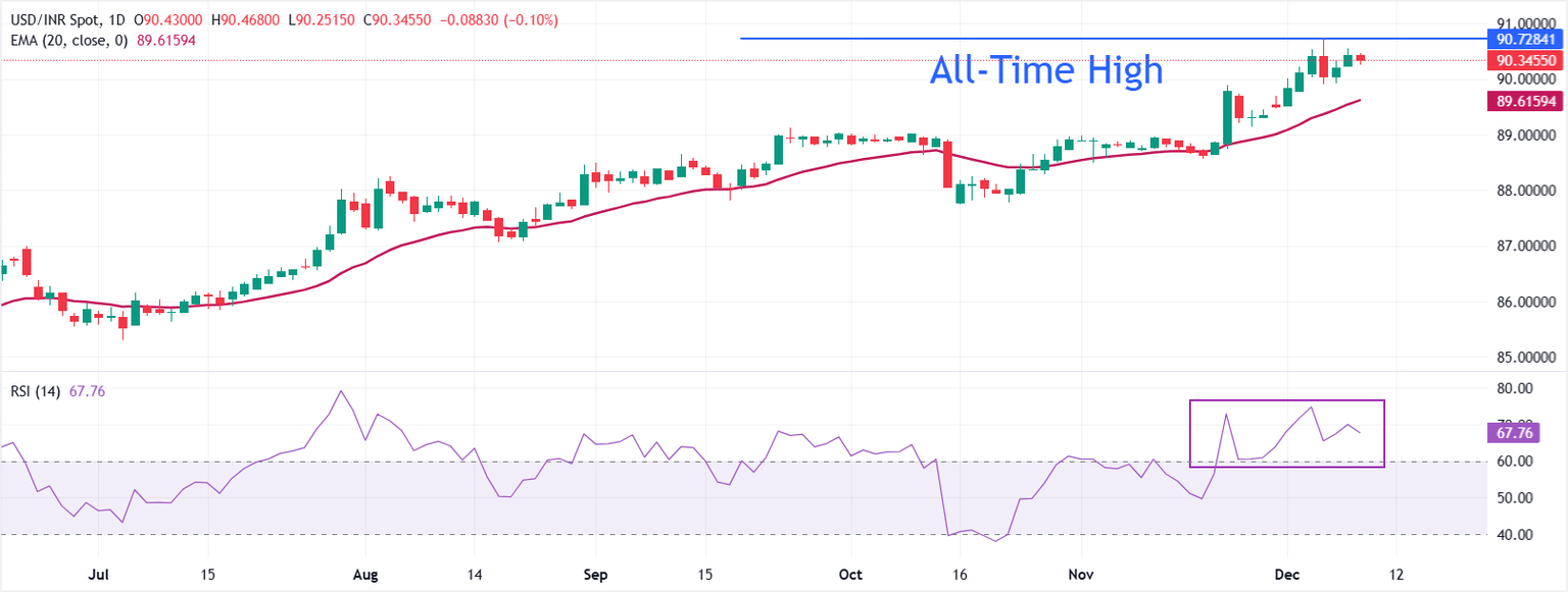 Análisis Técnico: USD/INR cotiza ligeramente a la baja alrededor de 90.35