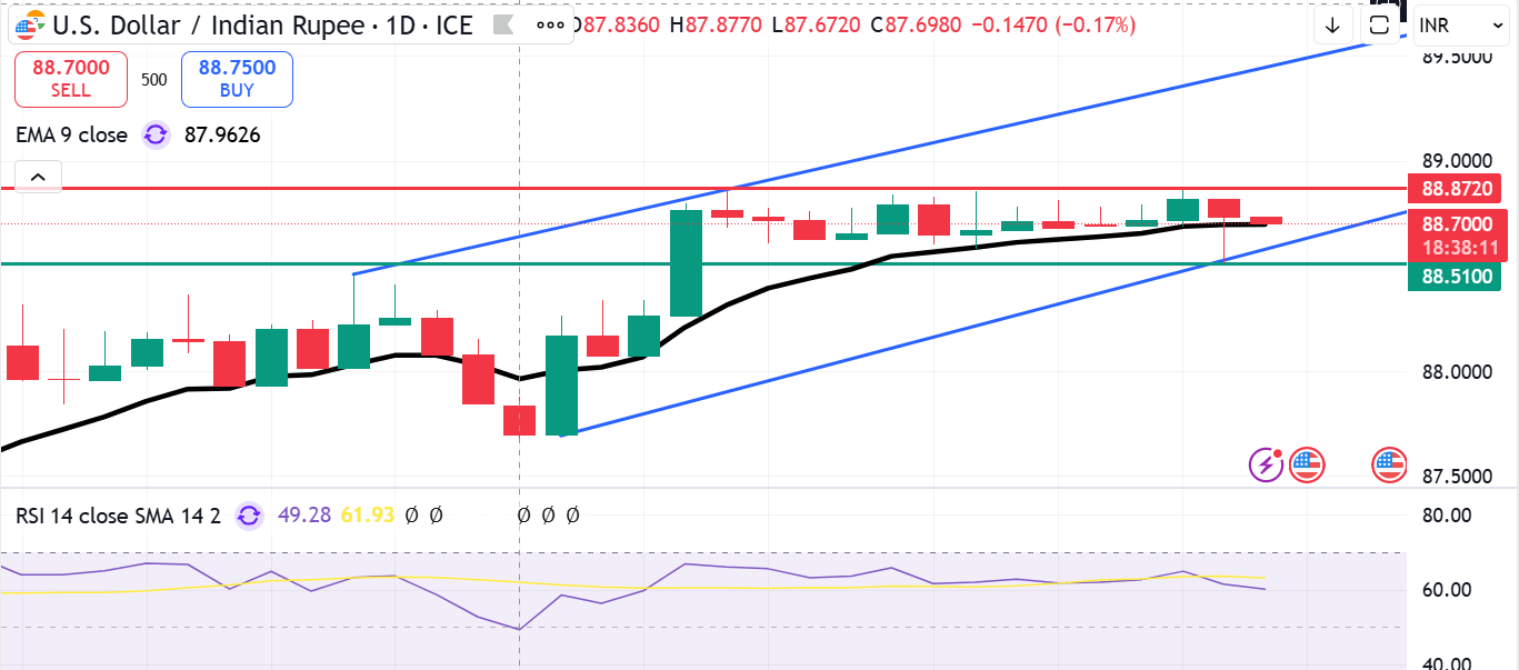 El USD/INR se mantiene tranquilo en 88.70 durante las horas asiáticas del lunes, con el análisis técnico sugiriendo un sesgo alcista ya que el par permanece dentro del patrón de canal ascendente. Además, el Índice de Fuerza Relativa (RSI) de 14 días se mantiene por encima del nivel 50, fortaleciendo el sesgo alcista.