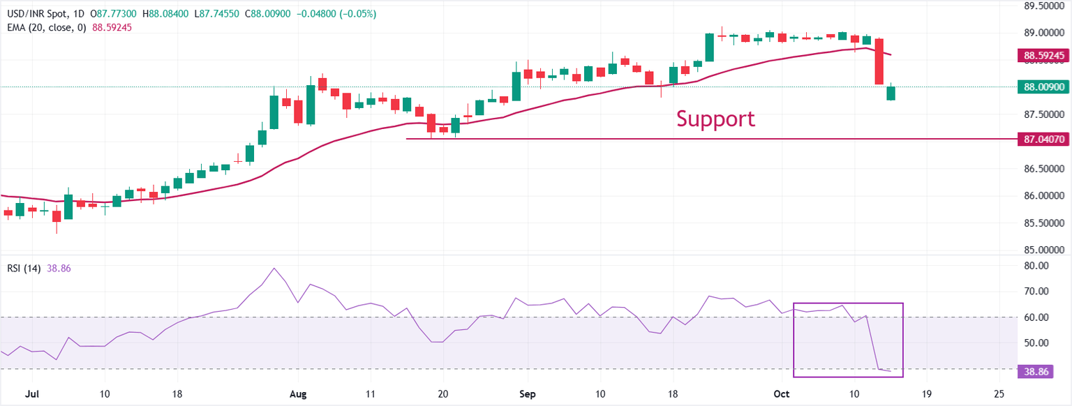 La Rupia india atrae ofertas después de caer a cerca de 87.80 frente al Dólar estadounidense el jueves. El par USD/INR enfrentó una fuerte presión de venta el miércoles tras la ruptura de la consolidación de tres semanas formada en un rango entre 88.75 y 89.10.