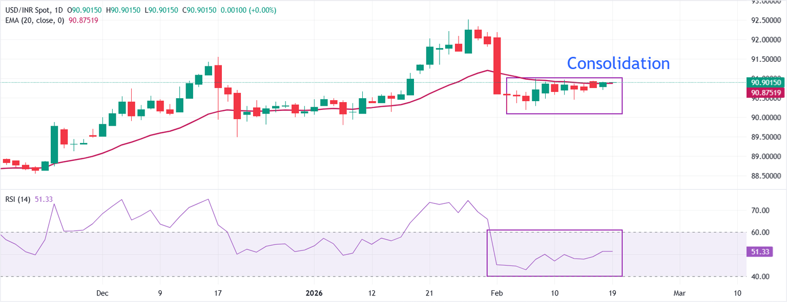El USD/INR cerró la sesión del miércoles con consolidación alrededor de 90.90. La media móvil exponencial (EMA) de 20 días ha estado inclinándose hacia abajo, señalando una tendencia de suavización, mientras que el precio se estabiliza justo por encima del promedio en 90.87 para mantener intacto el soporte a corto plazo. En los últimos días de negociación, el par ha estado operando en un rango estrecho entre 90.18 y 91.00.