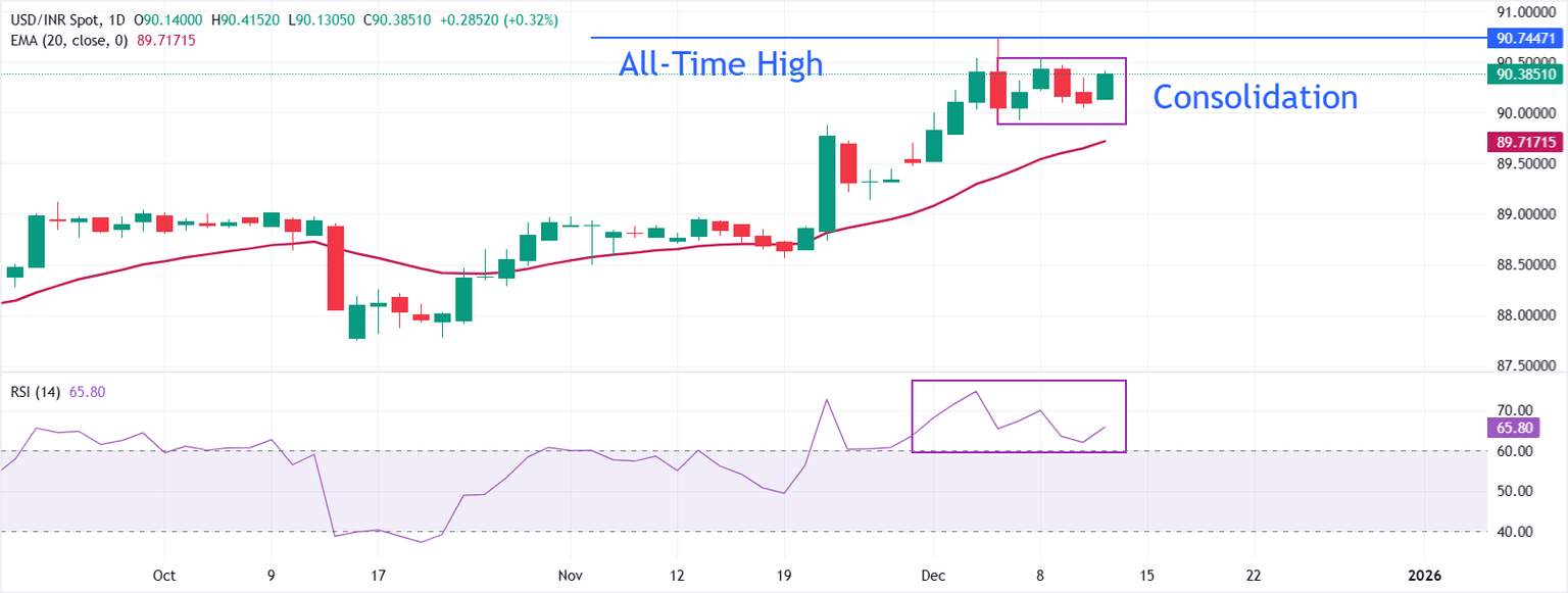 Análisis Técnico: USD/INR apunta a revisitar el máximo histórico cerca de 90.70