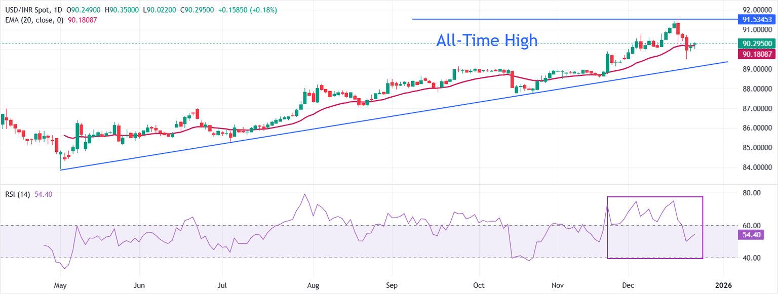En el gráfico diario, el USD/INR cotiza a 90.2950. La Media Móvil Exponencial (EMA) de 20 días sube y se sitúa en 90.1809, manteniendo el sesgo a corto plazo positivo ya que el precio se mantiene por encima de ella.