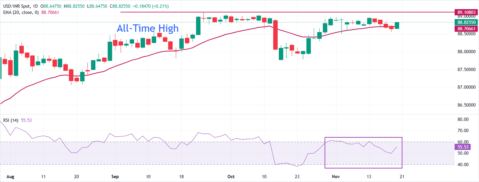El par USD/INR salta a cerca de 88.80 el jueves. El par rompe una racha de pérdidas de cuatro días después de atraer ofertas por debajo de la media móvil exponencial (EMA) de 20 días, que cotiza alrededor de 88.70.