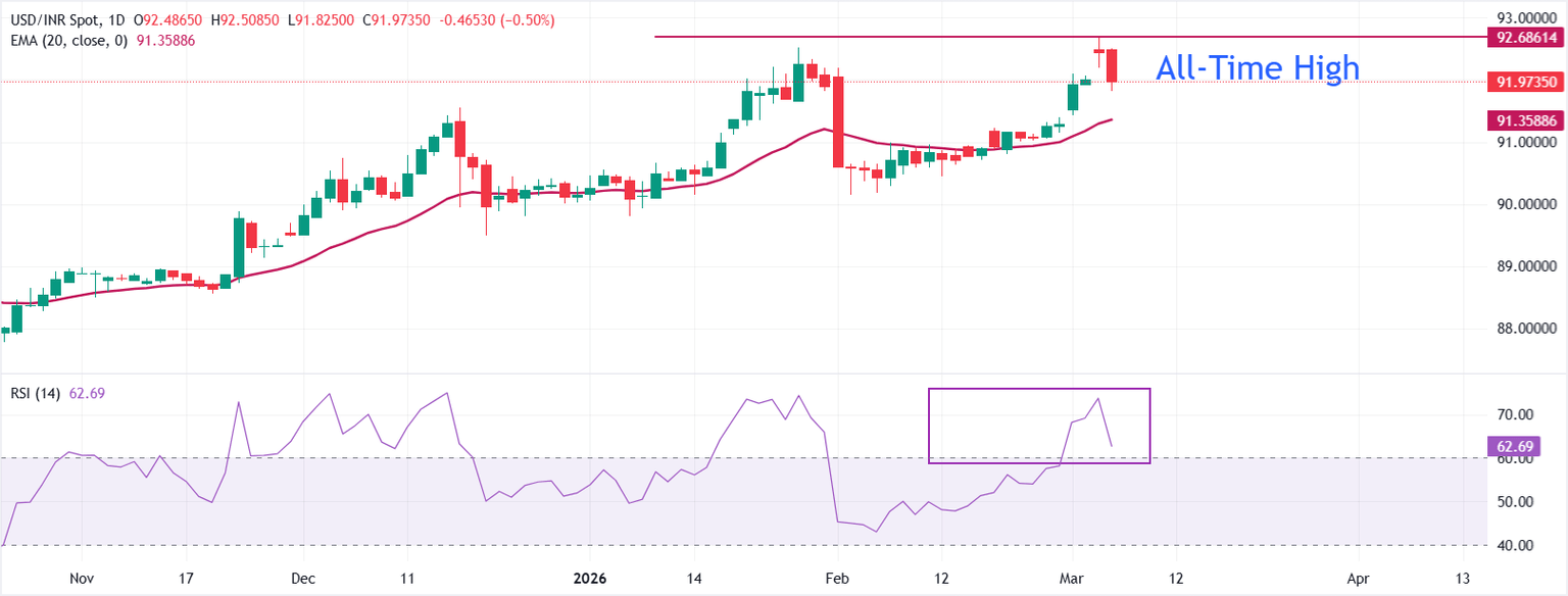 El USD/INR corrige bruscamente a cerca de 91.82 durante la sesión de negociación asiática el jueves. Sin embargo, el tono a corto plazo sigue siendo alcista ya que el spot se mantiene por encima de la media móvil exponencial (EMA) de 20 días, que está cerca de 91.36.