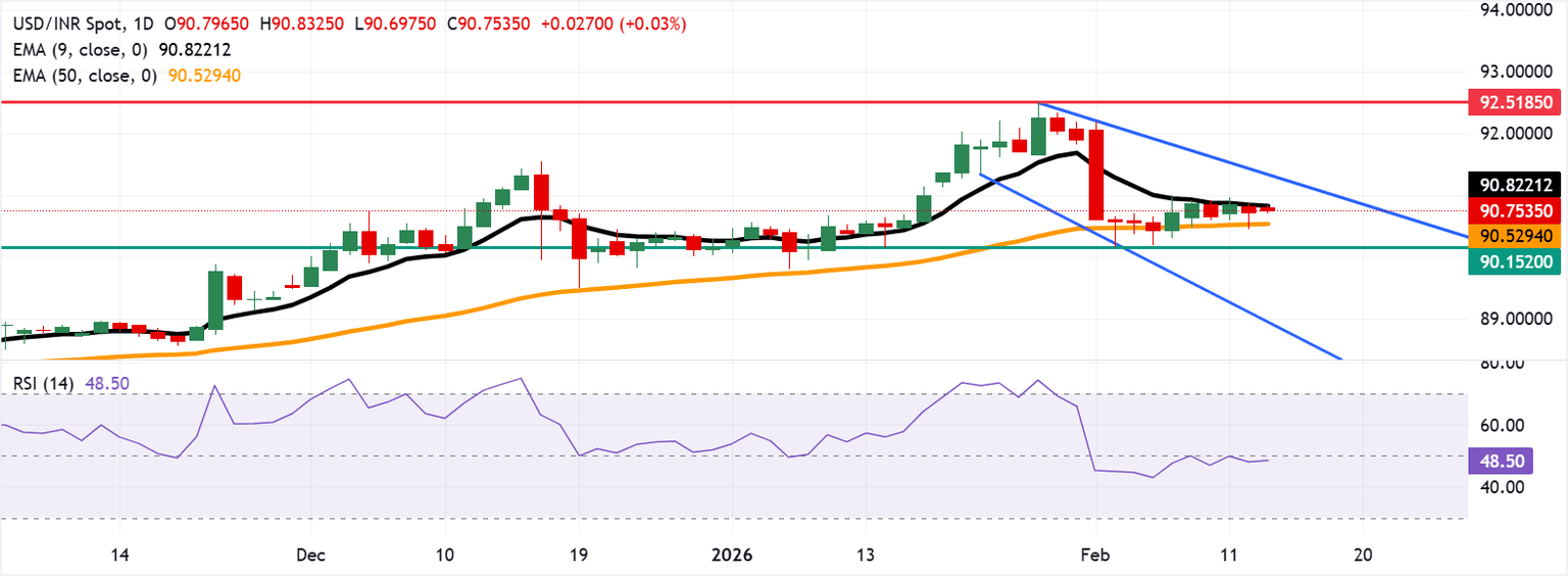 El USD/INR se está negociando alrededor de 90.70 al momento de escribir. El análisis del gráfico diario sugiere un sesgo bajista prevaleciente, con el par moviéndose dentro de un canal descendente. El par se sitúa por debajo de la media móvil exponencial (EMA) de nueve días, pero por encima de la EMA de 50 días, enmarcando un retroceso leve dentro de un sesgo alcista más amplio. La EMA de 50 días sigue subiendo, mientras que la EMA de nueve días se suaviza, indicando vientos en contra a corto plazo pero un soporte intacto a medio plazo. El Índice de Fuerza Relativa (RSI) de 14 días en 48.72 es neutral y se acerca a 50, lo que sugiere un impulso estabilizado.