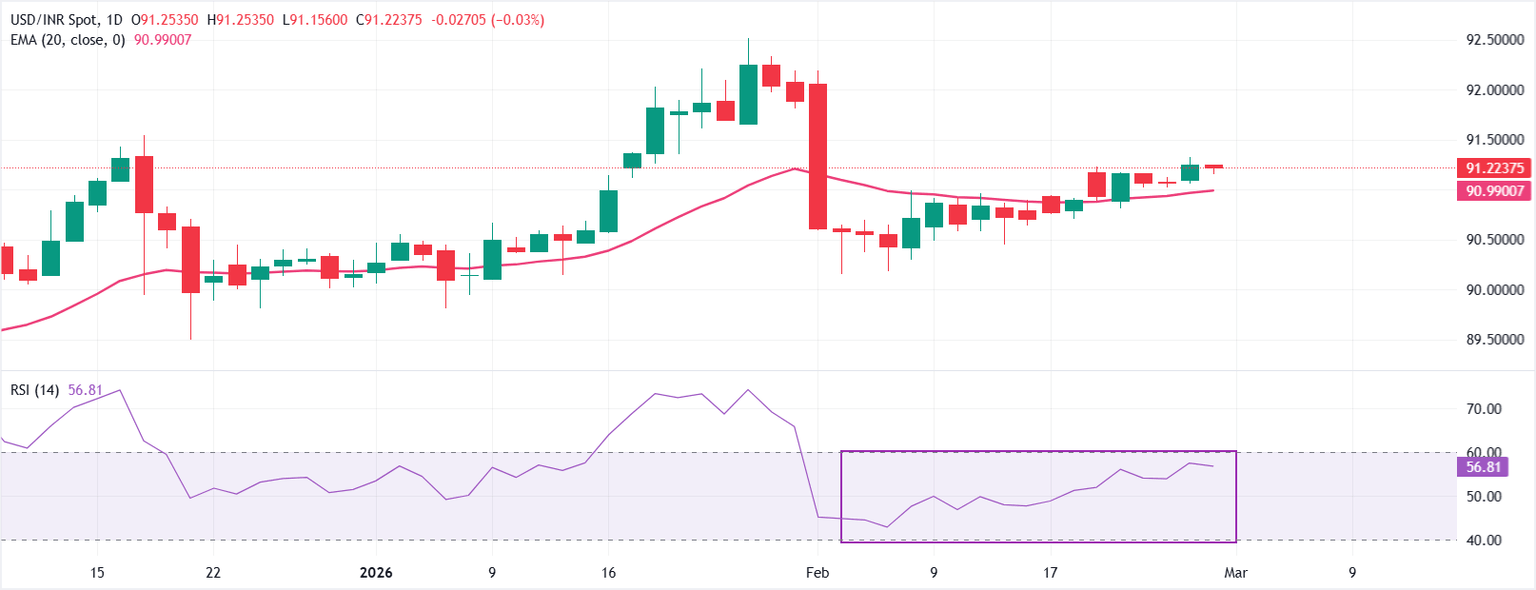 El USD/INR cotiza casi plano cerca de 91.20 durante el tiempo de prensa. El par mantiene un leve sesgo alcista mientras se estabiliza por encima de la media móvil exponencial (EMA) de 20 días, que se ha aplanado y ahora sigue justo por debajo del spot.