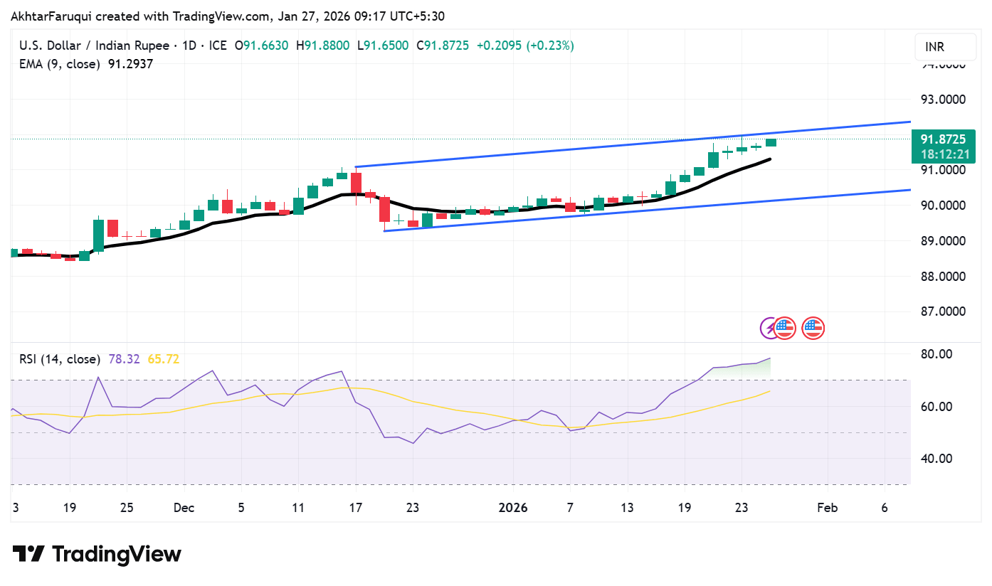 El USD/INR se cotiza alrededor de 91.80 en el momento de escribir. El análisis técnico del gráfico diario sugiere un sesgo alcista persistente, ya que el par está subiendo dentro del patrón de canal ascendente. Sin embargo, el Índice de Fuerza Relativa (RSI) de 14 días en 78 sugiere que el activo está sobrecomprado, señalando un impulso estirado y un mayor riesgo de un retroceso o consolidación a corto plazo.