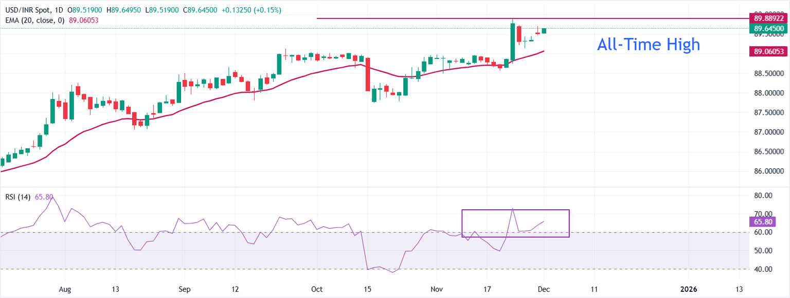 En el gráfico diario, el USD/INR se cotiza a 89.6450. La EMA de 20 días sube y se mantiene por debajo del precio, reforzando un sesgo alcista y manteniendo la tendencia alcista intacta mientras esté por encima del promedio. El RSI en 65.80 (alcista) ha subido en las sesiones recientes, confirmando un impulso en mejora. El soporte inicial se sitúa en la EMA de 20 días en 89.0605.