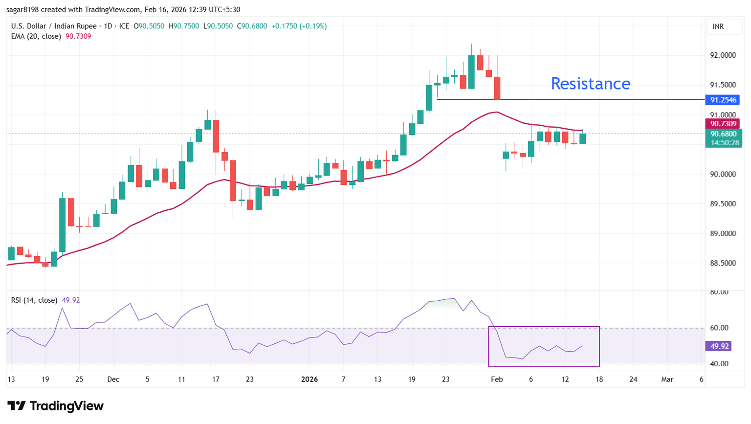 El USD/INR cotiza al alza cerca de 90.70 durante las horas de negociación de la tarde en India el lunes. El precio lucha por regresar por encima de la Media Móvil Exponencial (EMA) de 20 días, que cotiza alrededor de 90.73.