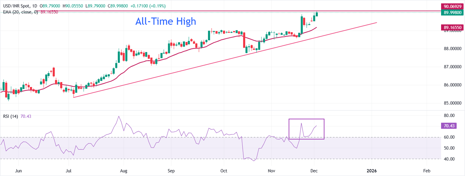 En el gráfico diario, el USD/INR cotiza a 89.99 en la sesión de apertura del martes. El par se mantiene bien por encima de la media móvil exponencial (EMA) de 20 días en 89.1655, y la pendiente más pronunciada confirma una tendencia alcista a corto plazo. Las caídas encontrarán soporte inicial en esa media.